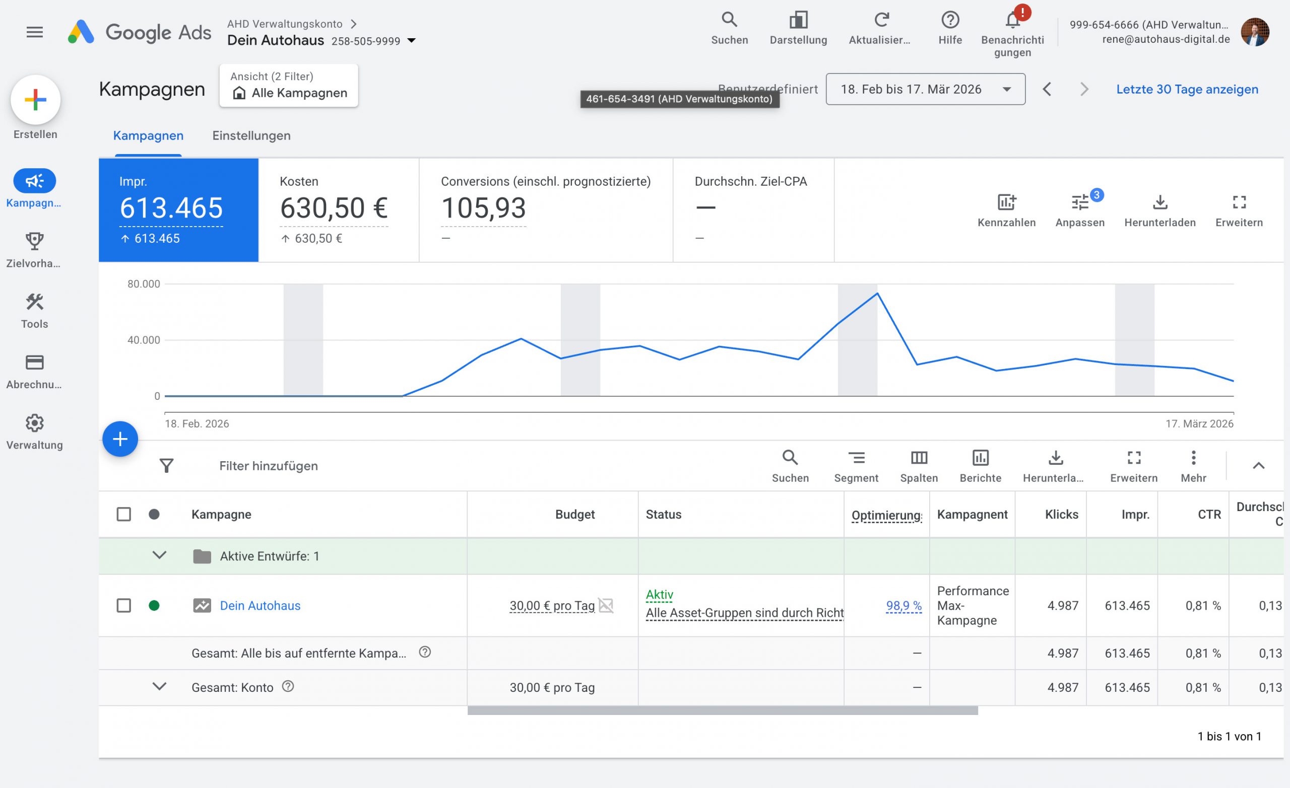 Die Prognose ist klar: Sobald die breite Masse der Autohäuser die Portale verlässt und zu Google drängt, werden die Klickpreise steigen. Wer jetzt mit AHD als offiziellem VFSP-Partner startet, sichert sich den regionalen Marktanteil zu einem Bruchteil der zukünftigen Kosten und baut historische Kampagnen-Daten auf, die der Algorithmus liebt.